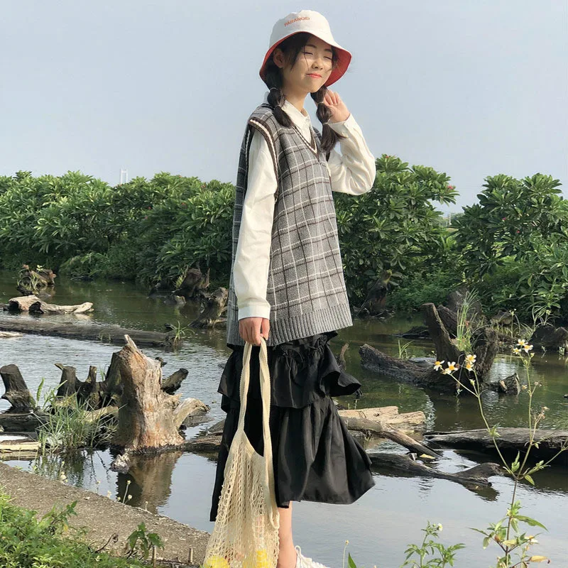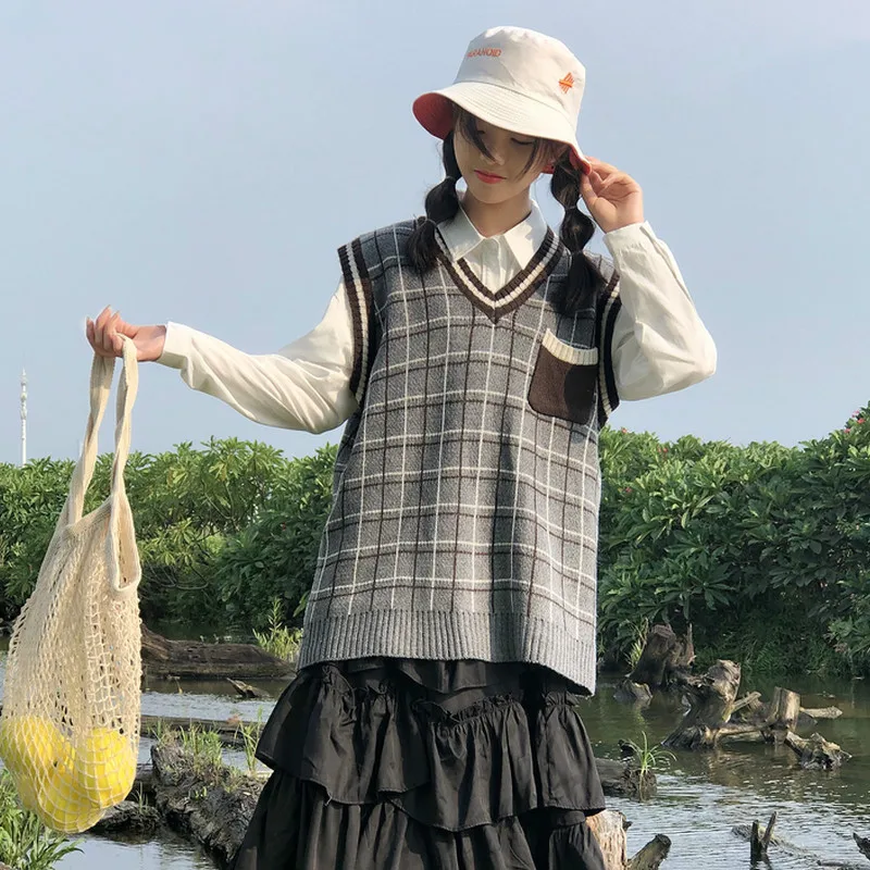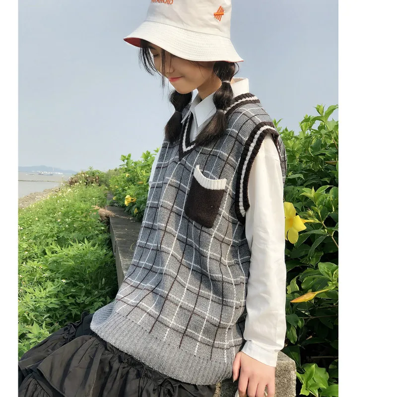 Best Photo Shoot 8553 Autumn Clothing New Style Loose-Fit Sweater Coat Vest Vest College Style Plaid Spr